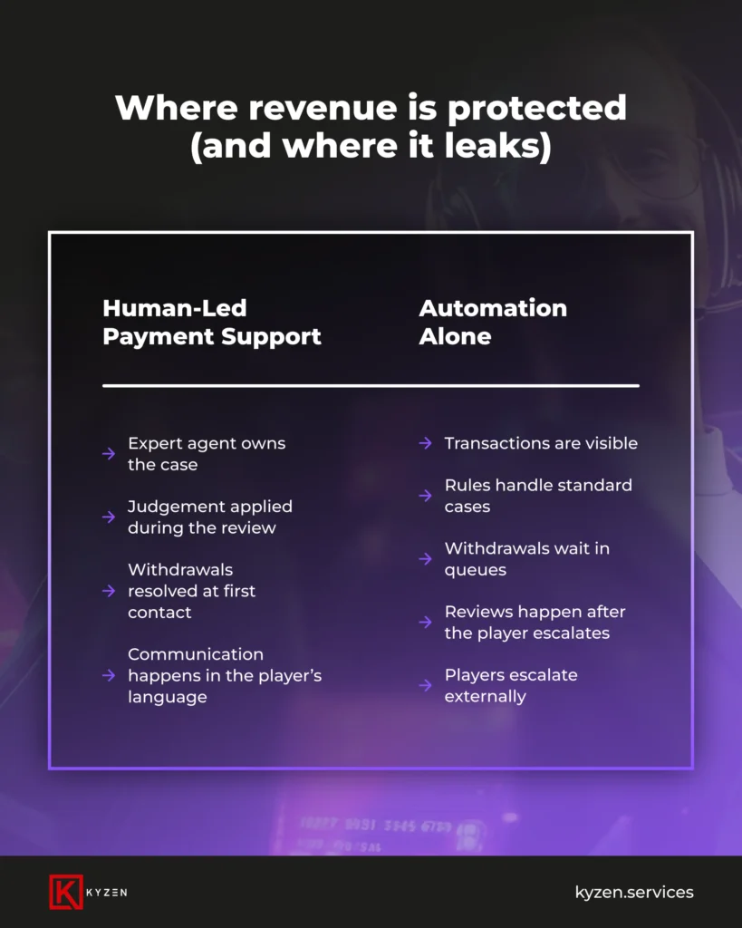 Payment tools handle routing, fallbacks, and method optimization. Human agents make the judgement calls that protect trust when a withdrawal enters review, a VIP needs clarity, or accountability is required.